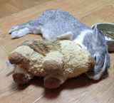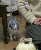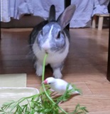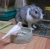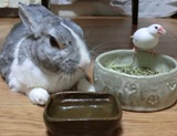 ちょっと油断すると、 文ちゃんはすぐにボクのごはんを横取りするんだ! その牧草、文ちゃんにはちょっと固すぎると思うけど・・・
